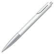 Minimalist plastic retractable ballpoint with clever inset pocket clip. Triangular barrel won't roll off the desk and is comfortable to hold. Matt white finish with metallic silver front-end and push-button.