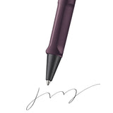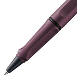 LAMY safari rollerball pen with ABS barrel and cap, and triangular grip area. Strong metal wire pocket clip. Liquid ink roller refill, medium blue.