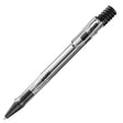 vista ballpoint with crystal-clear ABS barrel and triangular grip section. Push-button retract mechanism - button is gaitered with matt black rubber. Strong sprung steel clip in polished black chrome.