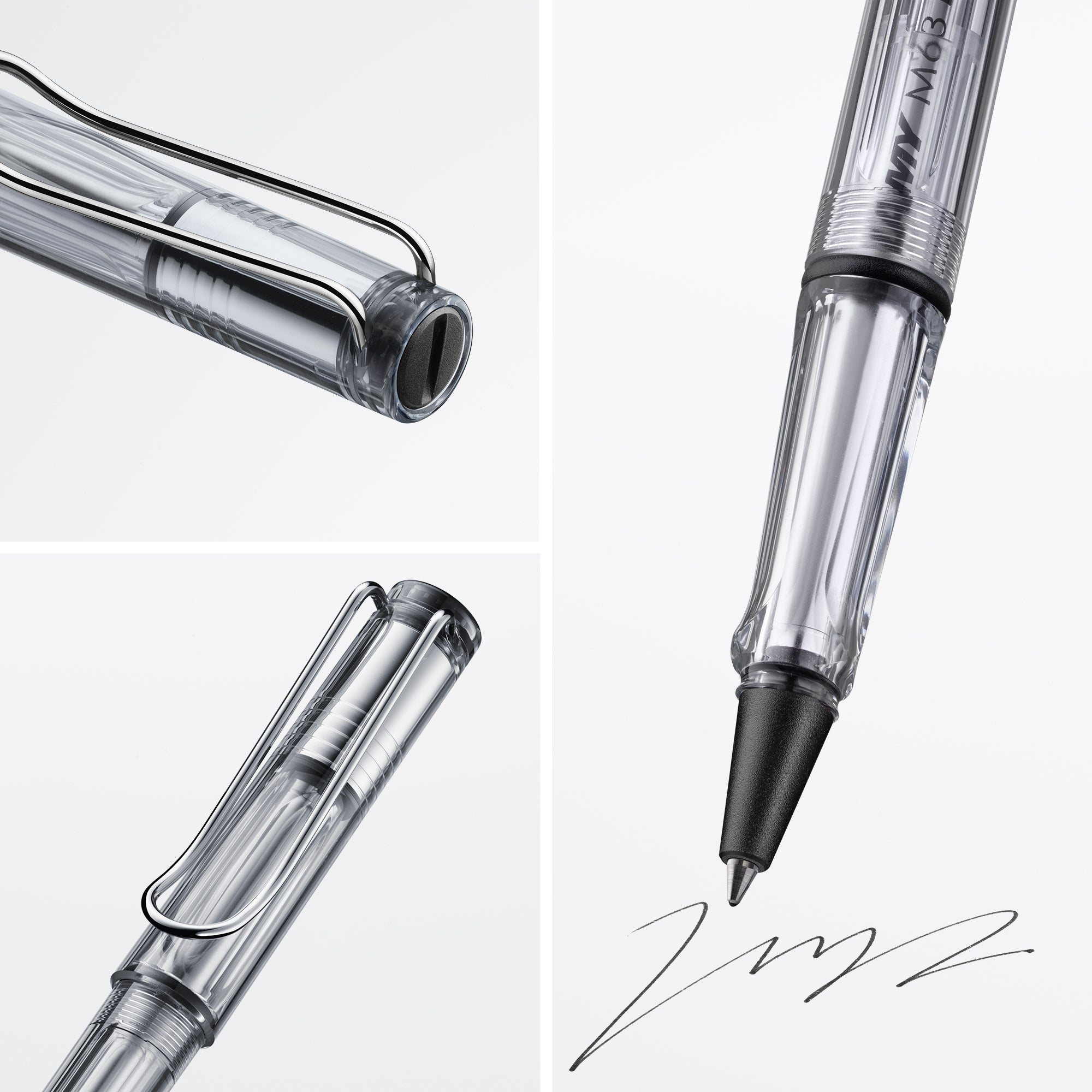 vista rollerball pen with crystal-clear ABS barrel and cap, with triangular grip area. Strong metal wire pocket clip. Liquid ink roller refill, medium blue.