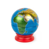 Globe-shaped sharpener that doubles as a desk accessory. The globe container sits on top of the sharpener which doubles as a stand for the globe.