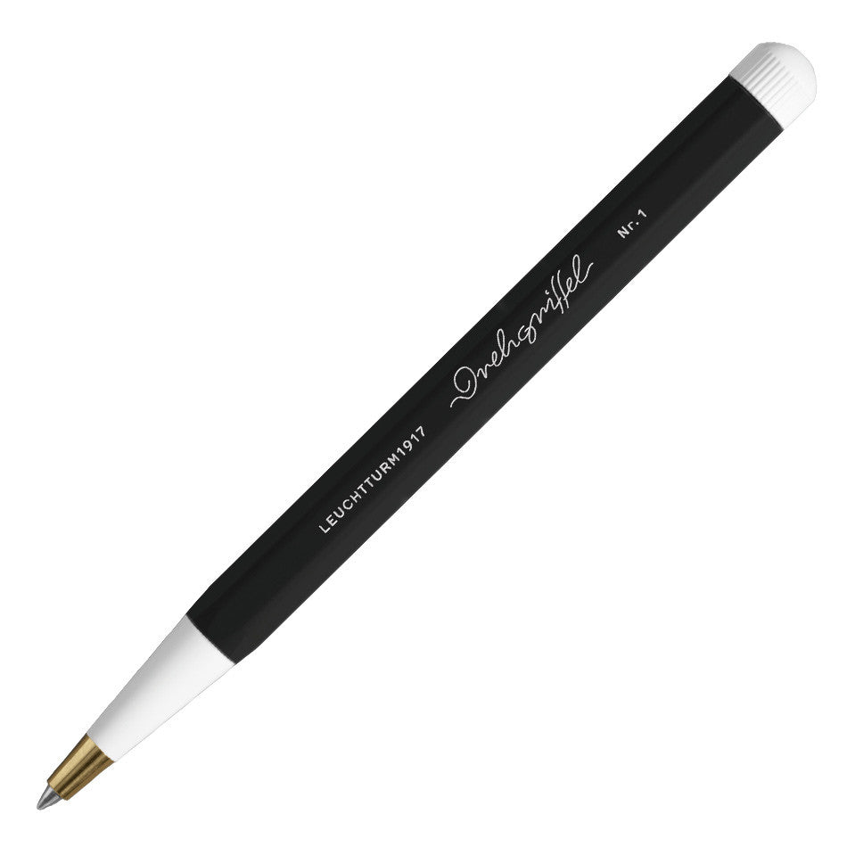 This is the Drehgriffel No 1: it means 'twist stylus'. The hexagonal barrel is precision-milled aluminium and brass and finished in Black, to match the LEUCHTTURM1917 notebook cover. The barrel end employs a spring-loaded twist mechanism to extend the tip.