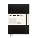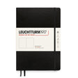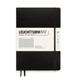 LEUCHTTURM1917 Hardcover B5 Notebook. Rigid cover in black with rounded corners, an expandable pocket in the cover, elastic fastener, bookmark and a thread-stitched inner book.