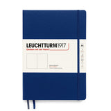 LEUCHTTURM1917 Hardcover B5 Notebook. Rigid cover in navy with rounded corners, an expandable pocket in the cover, elastic fastener, bookmark and a thread-stitched inner book.