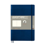 LEUCHTTURM1917 Softcover B6+ Notebook. Soft, flexible cover in navy blue with rounded corners, an expandable pocket in the cover, elastic fastener, 2 fabric bookmarks and a thread-stitched inner book.