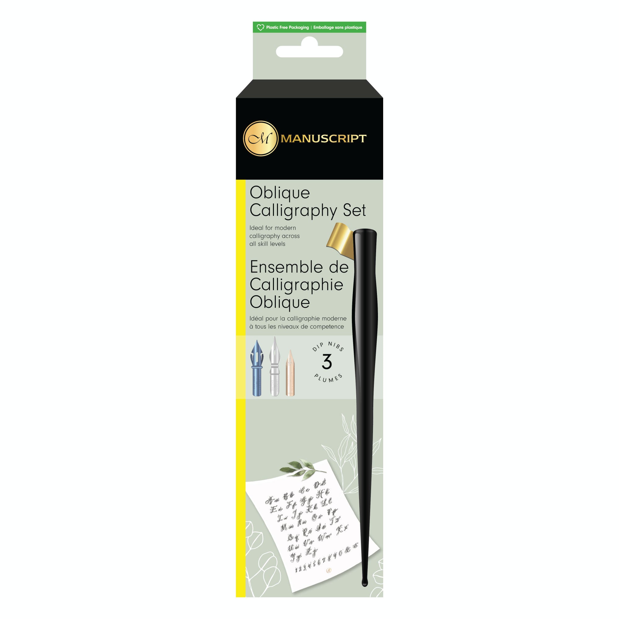 The Oblique Modern Calligraphy Set from Manuscript has most things you need for a stab at modern calligraphy, but with a nod at the traditional. There's a dip pen barrel - in black: very traditional - but it is equipped with a angled slot in which to position the nib, to achieve the required position for modern calligraphy. There are three different pointed Leonardt nibs: also very traditional, and a bottle of black calligraphy ink. A set of clear instructions thanks to Joyce Lee of Artsynibs, completes the set. Oh, and don't forget the smart metal tin to keep everything in!