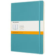 Moleskine Soft Cover Extra Large Notebook with sturdy but flexible reef blue cover and robust rounded corners. Expandable inner pocket that contains the history of Moleskine, and blue elastic closure and fabric page marker.