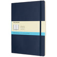 Moleskine Soft Cover Extra Large Notebook with sturdy but flexible sapphire blue cover and robust rounded corners. Expandable inner pocket that contains the history of Moleskine, and blue elastic closure and fabric page marker.