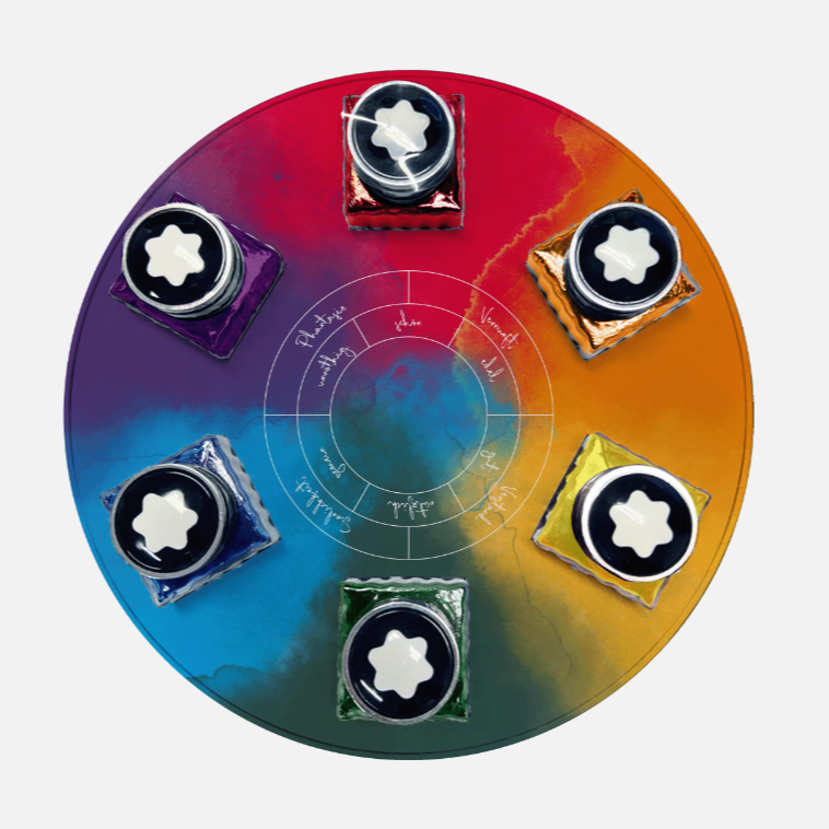 The colour wheel offers 6 different ink hues: Amethyst Purple, Egyptian Blue, Modena Red, Manganese Orange, Golden Yellow and Irish Green. Each bottle contains 30 ml.