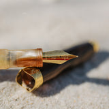 The Horizon is a piston-filling fountain pen with a stainless steel nib and comes in a traditional cigar-shaped barrel with elements that have been modernised. The inspiration for the Horizon range comes from the Horizon (shocking, I know). The colours are designed to represent the different picturesque views it can offer at different times during the day or under certain natural events. Each pen is hand-crafted from a piece of resin that is made of wonderful swirling patterns.