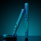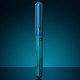 The Nautilus collection features Nahvalur's proprietary ink window with three intricate windows carved on the pen's barrel. Features a piston filling mechanism. Marine blue custom-made German ebonite barrel with special purple and blue trim and screw-on cap with pocket clip. Stainless steel nib with blue-plating in a range of sizes.