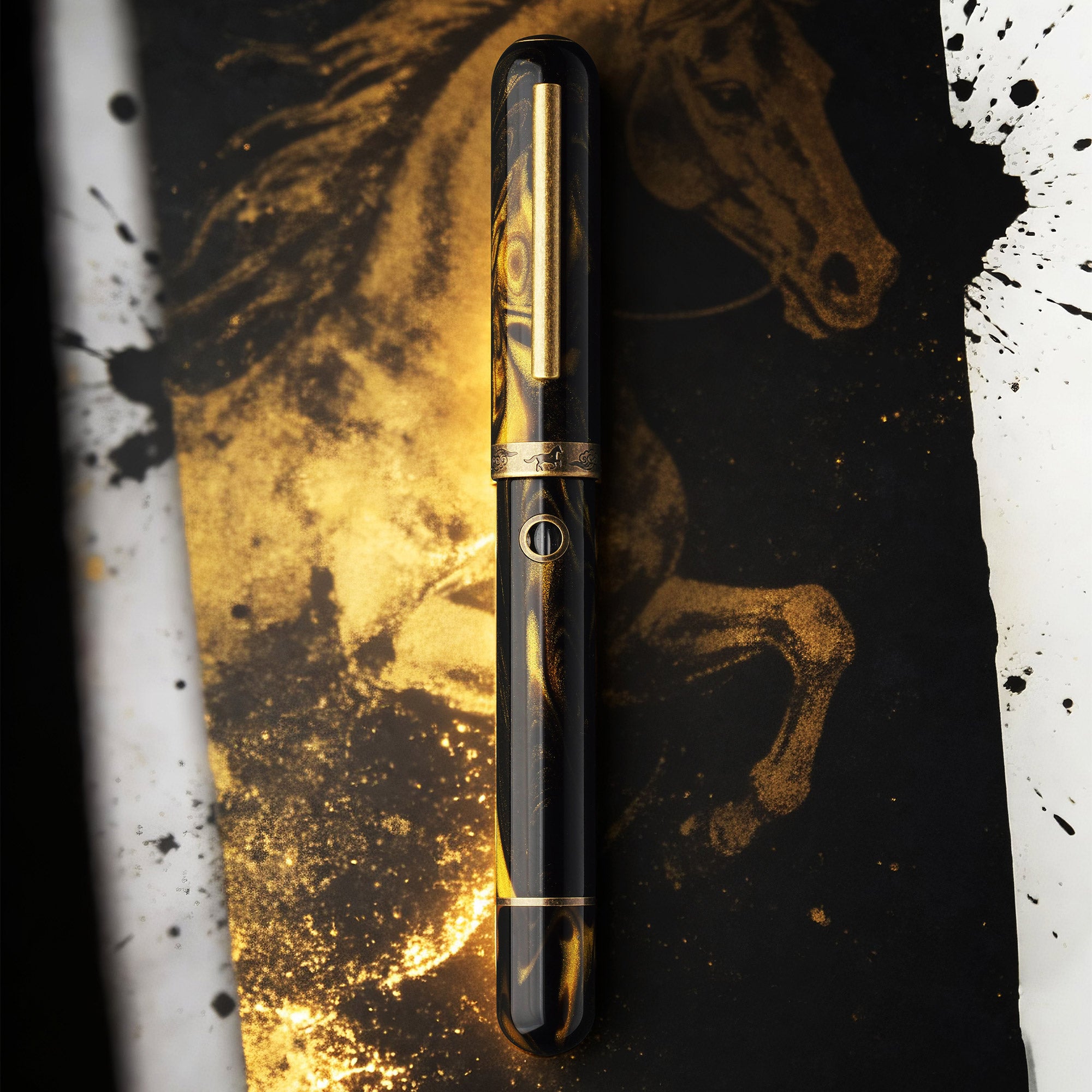 This horse-inspired Nautilus features Nahvalur's familiar porthole-inspired ink windows and the convenient piston filling mechanism. The striking black and gold swirled resin makes for a beautiful pen, with burnished bronze trim, and a cap ring featuring an engraved pattern of horses. Numbered limited edition of just 999 pens worldwide.