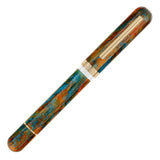 The Voyage is a piston-filling fountain pen with a stainless steel nib. The Summer barrel is constructed from swirling patterns of acrylic in a hot kaleidoscope of red, blue, green and orange. Each pen contains real diamond dust. It features polished trim with 'Nahvalur' inscribed into the barrel ring, and the screw-on cap sports a sturdy polished pocket clip.