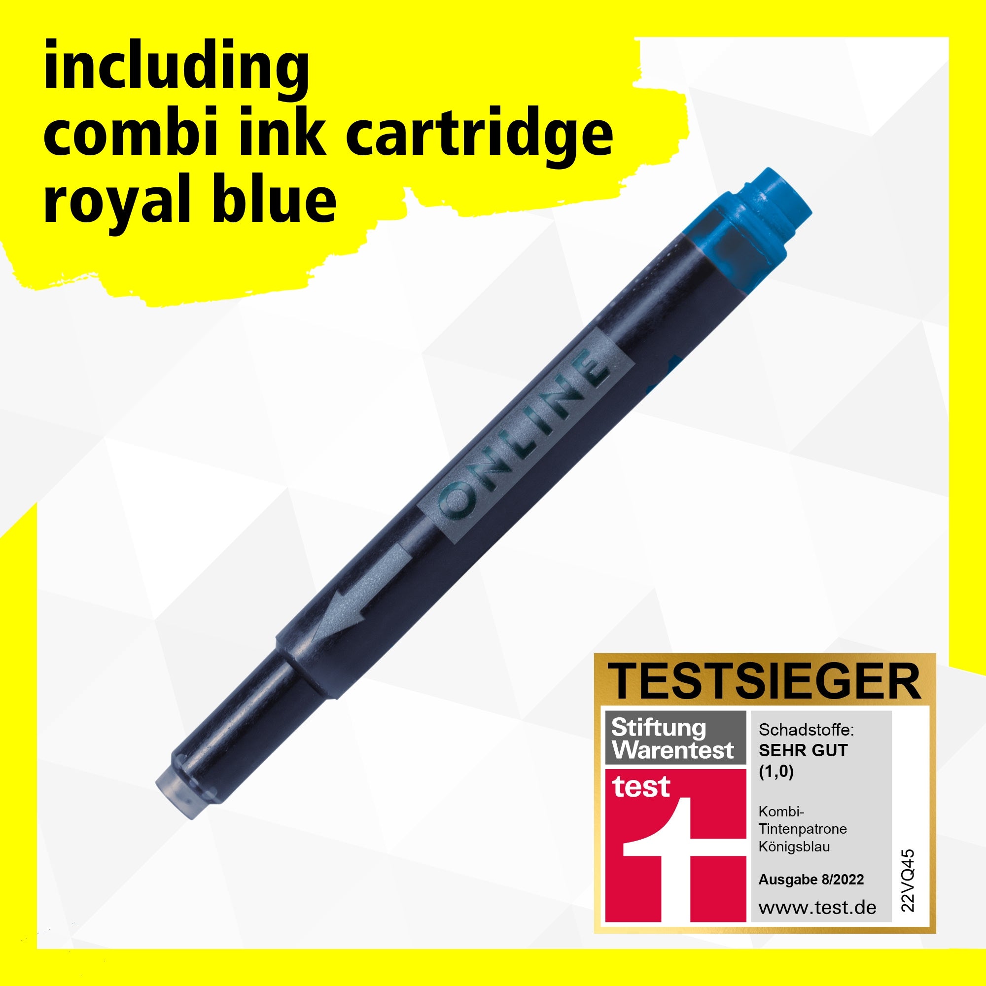 Stylish brushed aluminium fountain pen from ONLINE with a stainless steel medium sized nib. Equipped with a cartridge filling system. Use international standard sized ink cartridges or ONLINE's own Combi ink cartridges to refill.