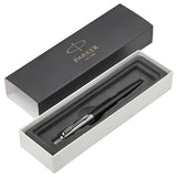 Push-button retractable ballpoint in black with chrome trim. Fitted with a standard Parker refill in medium blue.