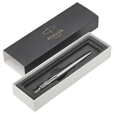 Push-button retractable ballpoint with stainless steel finish and chrome trim. Fitted with a standard Parker refill in medium blue.