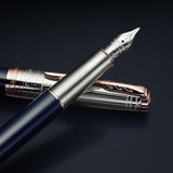 Hand-assembled from 22 individual pieces with meticulous attention to detail. Each pen features an 18k solid gold nib with a rhodium finish and a design inspired by the world map. The brushed steel shell is accented with pink gold trims, and the brass barrel is finished in a new blue lacquer. The laser-etched design on the sterling silver and palladium-coated cap features vertical lines representing the wooden walking sticks that can be stamped at each mountain station passed en route to the summit, and displays the legendary name of Mt. Fuji and its elevation, evoking the spirit of audacious adventure. Intricate engravings, inspired by the 5th Station, a popular starting point, and the Torii Gate close to the summit at its end, take us on a journey to Mt. Fuji’s peak.