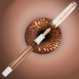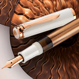The Copper Rose Gold M200 is a special edition of the classic design with a beautiful shimmering copper body, a white cap and grip section with complementary rose gold accents. To create the barrel effect, precious resin is combined with copper-coloured particles. It features the M200's signature translucent ink-view window just above the grip section allowing you to peer into the piston mechanism.