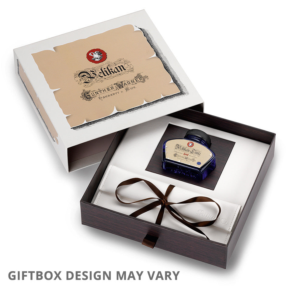 Supplied in a soft pouch in a luxury gift box with a bottle of Pelikan 4001 historical edition royal blue ink (62.5ml).