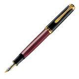 Pelikan Souveran M400 fountain pen in red and black Stresemann stripes. Differential piston filling system; hand-finished 14ct/585 bi-colour gold/rhodium nib; brass components; diamond-ground barrel; gold-plated brass trim; and a wide range of nibs. A precision instrument of the highest quality.