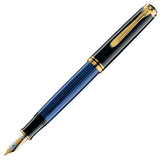 Pelikan Souveran M800 fountain pen in blue and black Stresemann stripes. Differential piston filling system; hand-finished 18ct/750 bi-colour gold/rhodium nib; brass components; diamond-ground barrel; gold-plated brass trim; and a wide range of nibs. A precision instrument of the highest quality.