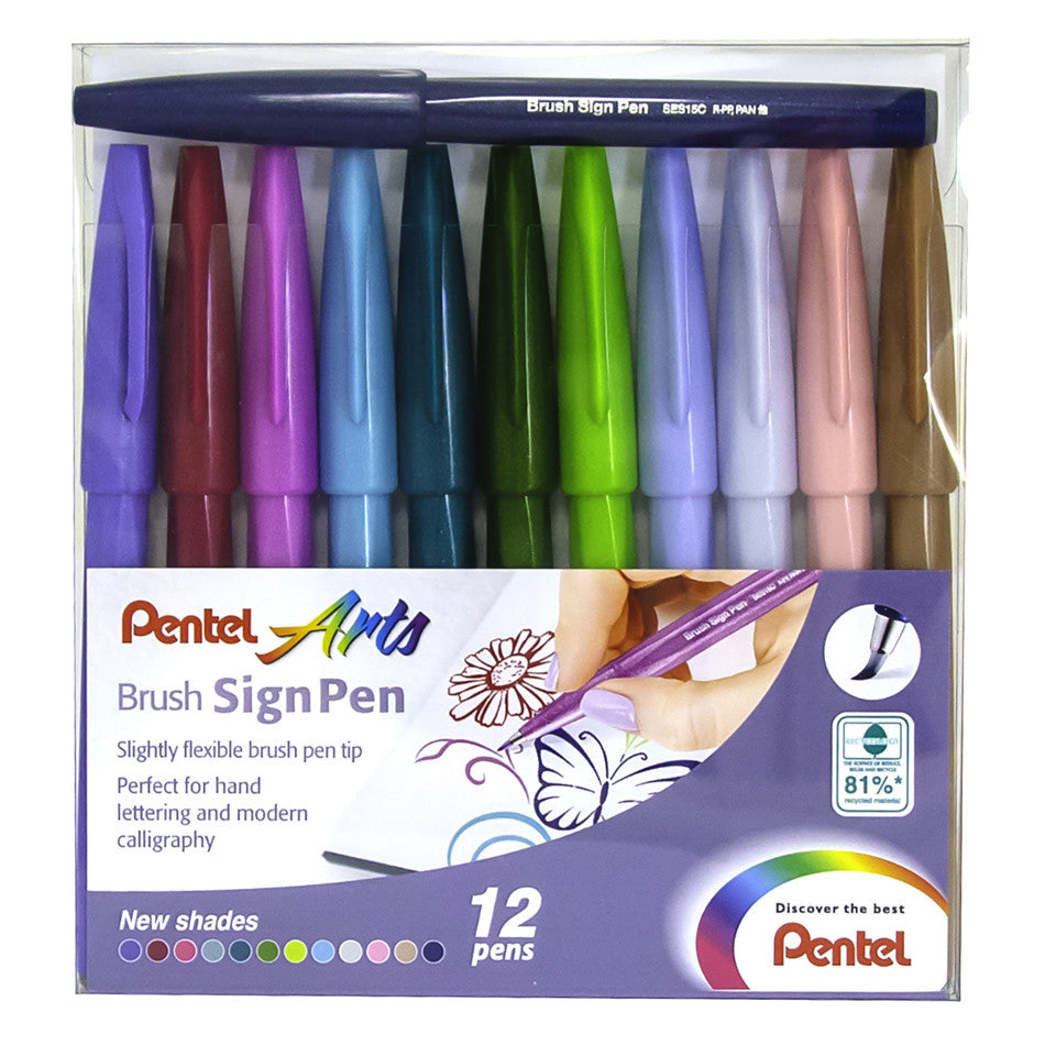 A complete set of the 12 newest colours of the Pentel Touch Brush Sign Pen SES15; one each of blue-black, burgundy, blue-violet, grey-blue, light green, light grey, olive green, pale blue, pale brown, pale pink, pink-purple and turquoise-green .