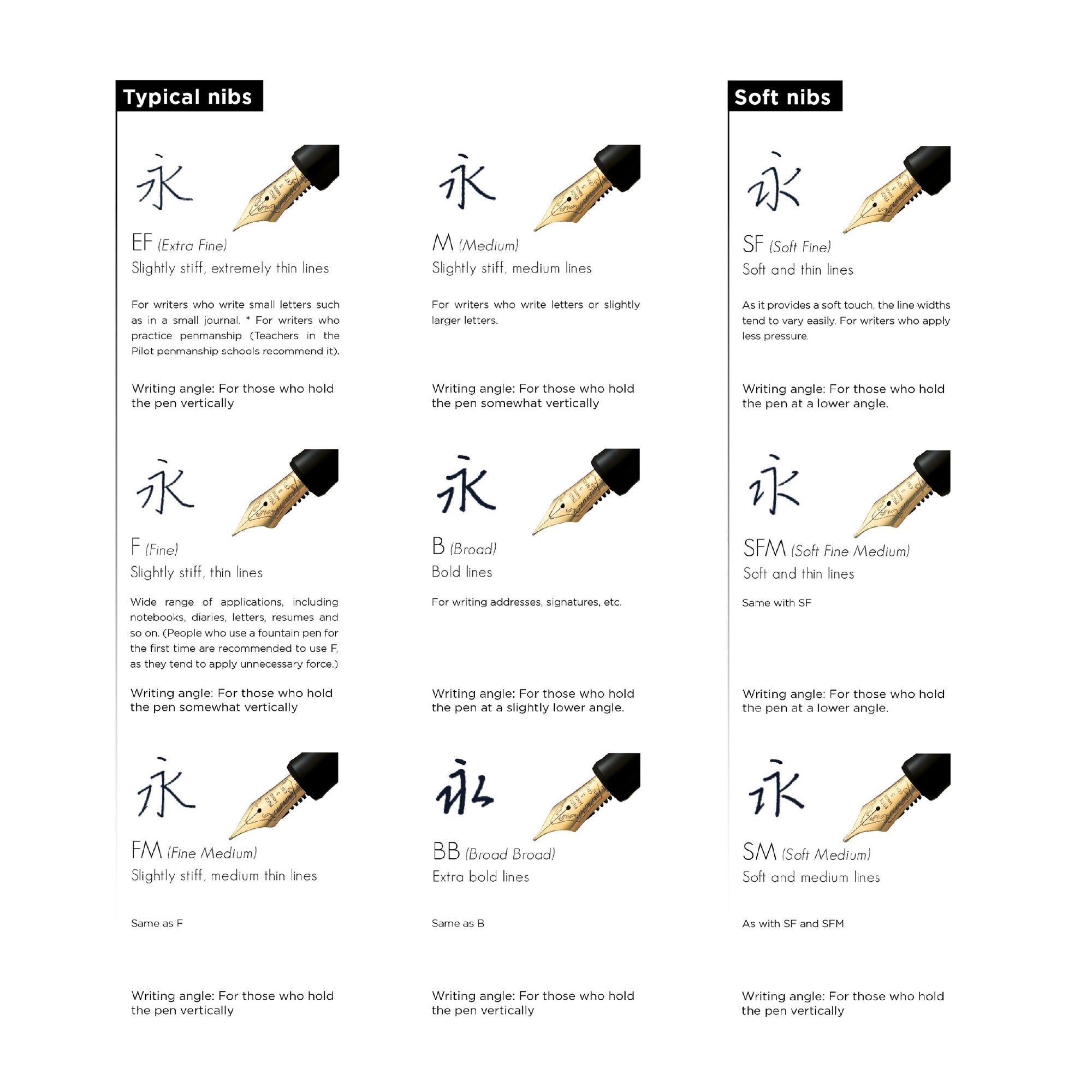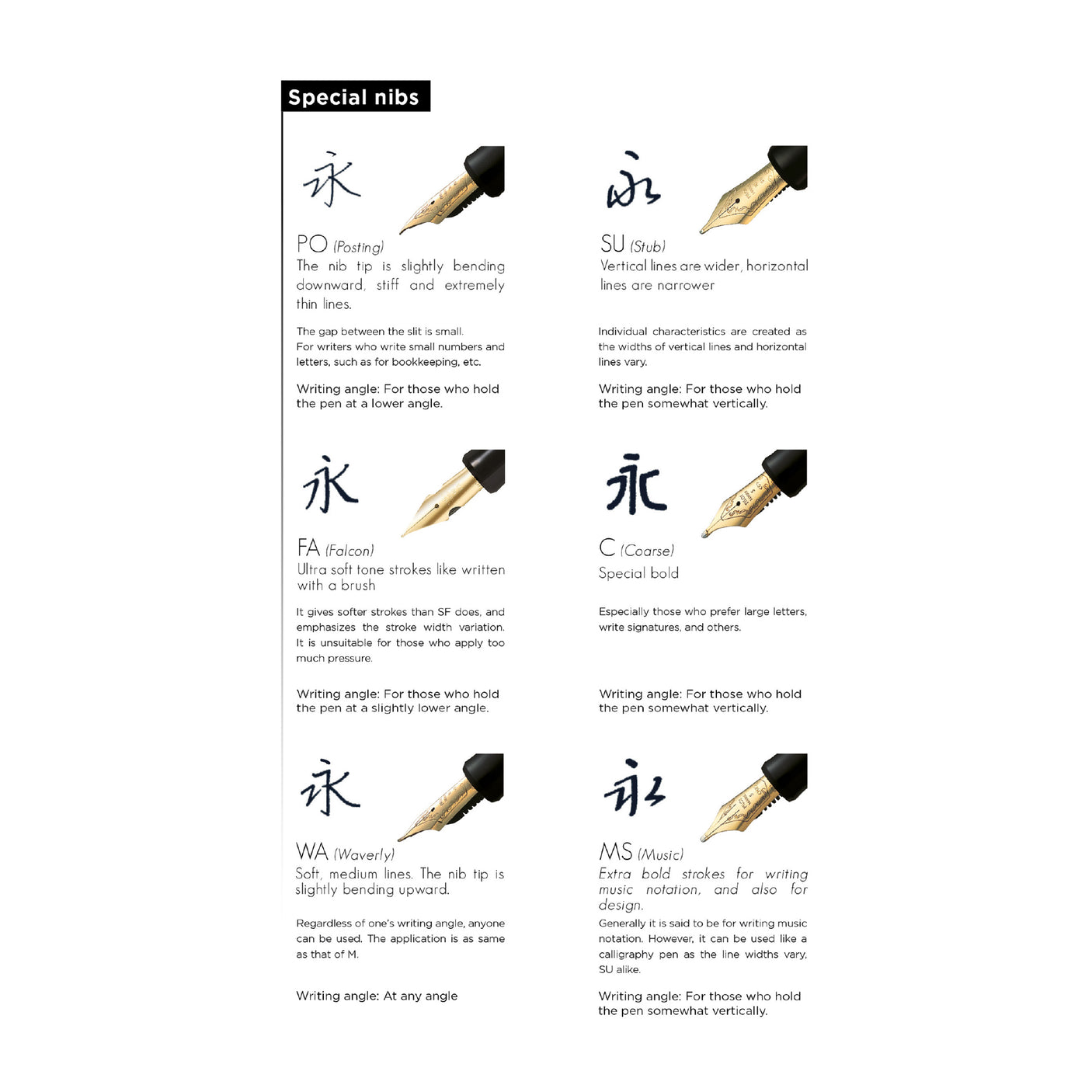 Speaking of 'other nib sizes', there's an amazing range available with these pens, with choices you'll rarely find anywhere else. Like the Posting nib, an extra stiff nib with a slight downward bend, originally popular for writing with carbon paper; or the Waverly nib with an upturned tip for extra smoothness at different angles. Three sizes of soft nibs for a bit of flex, or the Falcon nib for more flex. For another view of all the nib options, see this Pen Addict post.