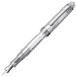 Clear crystal AS resin barrel with rhodium-plated trim. The nib is a beautiful piece of work, made in-house at Platinum, and hand-tested at the factory. 14kt gold, plated with rhodium.