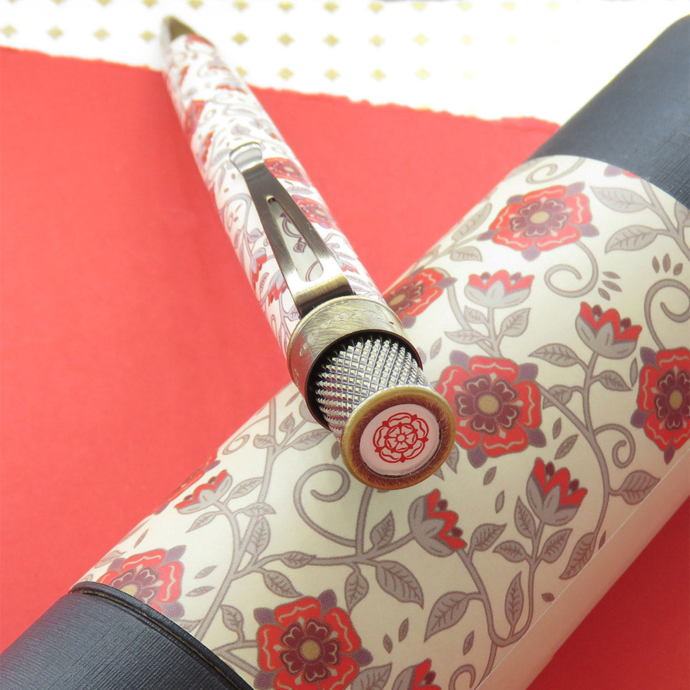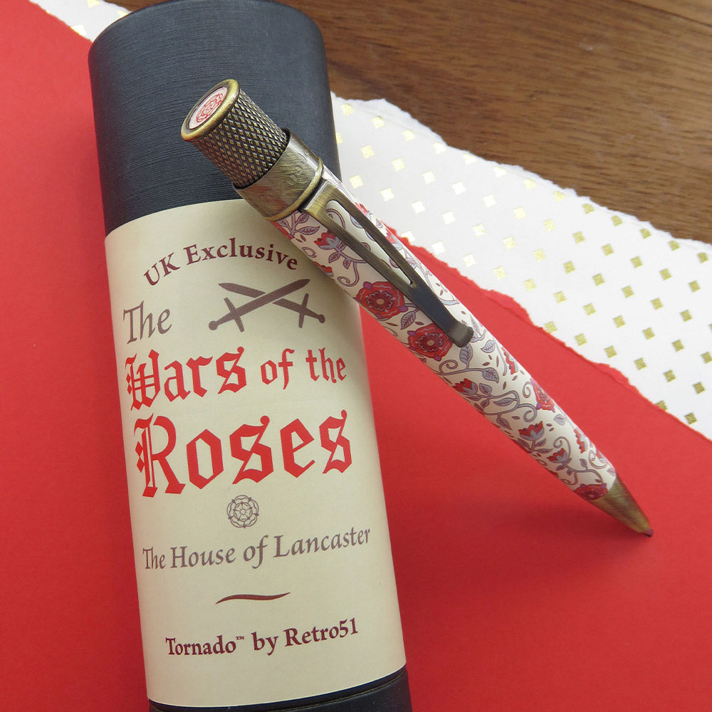 Inspired by one of the longest and most famous civil wars in English History, the War of the Roses Limited Edition rollerball pen is a UK exclusive. The barrel features a satin floral design which is complemented nicely by antique brass trimmings. The Lancaster red rose emblem can be found on the top disc to complete the design.