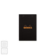 Rhodia Bloc No.14 head-stapled notepad, 110mm x 170mm. Coated card cover flips up and folds back out of the way. Card-backed notebook has 80 micro-perforated detachable sheets of top-quality 80gsm superfine vellum paper. Black cover with orange Rhodia logo.