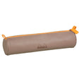 Taupe Rhodiarama pencil case constructed from wonderfully tactile Italian leatherette. Tubular profile, stylishly debossed on one side with the distinctive Rhodia logo. Orange leatherette zip closure with tabs at either end to ease opening and closing. Lined with ivory-coloured jersey fabric which also features a fabric tab with the Rhodia branding.