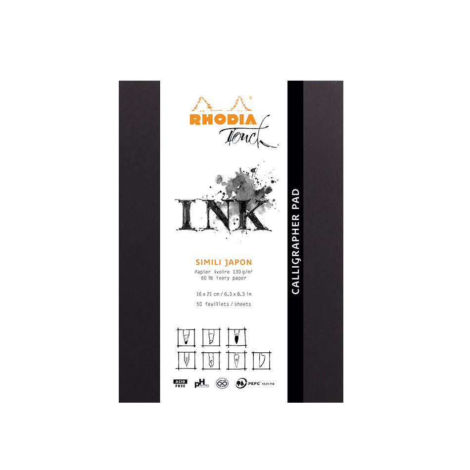 Rhodia Touch Calligrapher Pad in A5. Suitable for all kinds of ink including fountain pen ink, marker pens, brush pens and dip pen calligraphy ink. The heavyweight 130gsm paper is wonderfully smooth, perfect for lettering and calligraphy practice. 50 sheets of acid-free, pH-neutral white paper.