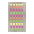 4 sheets of multicoloured neon dot stickers 10 x yellow, 10 x orange, 15 x pink and 15 x green 8mm dots per sheet.