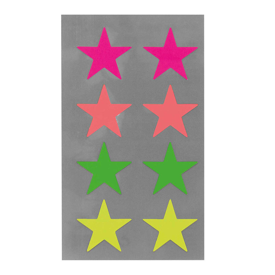 Neon star-shaped stickers. Contains 4 sheets of 8 stickers or 32 stars in fuchsia, orange, green and yellow. Use with different size stars for a great effect.