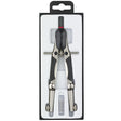 Quality compass with rapid-adjust feature. Simultaneous opening of both legs can be achieved by pressing the button mechanism on the compass legs. Precise adjustments can be made using the adjustment wheel. This mechanism provides a high degree of protection against unintended opening and closing of the legs giving consistent and reliable circles.