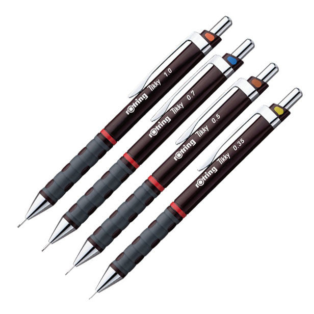 Return of the Tikky. Now in its third incarnation - the value professional pencil in classic rotring dark red has a subtly updated grip area. Fixed lead sleeve, strong metal pocket clip and replaceable eraser under the polished button. Available in the four standard lead sizes, with ISO colour coded flashes just below the push-button.