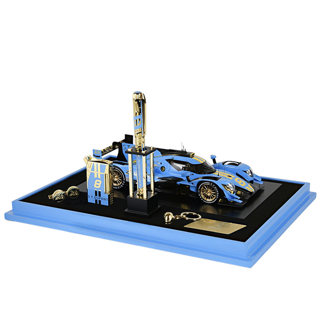 Part of the 2023 Collaboration range with Le Mans. This writing set commemorates 100 years of the iconic 24 hours of Le Mans race. Every element is thoroughly thought out. The number is for example is prominent in this set and not only represents the car number but is also a subtle nod to Duponts Parisian boutique at 8 rue Dieu. Inside you'll also find a highly polished gold keychain with a gold helmet, S.T Dupont cuff links, a Le Grand S.T. Dupont lighter and a trophy pen stand which holds the true prize of this set: The Line-D Multifunction pen.