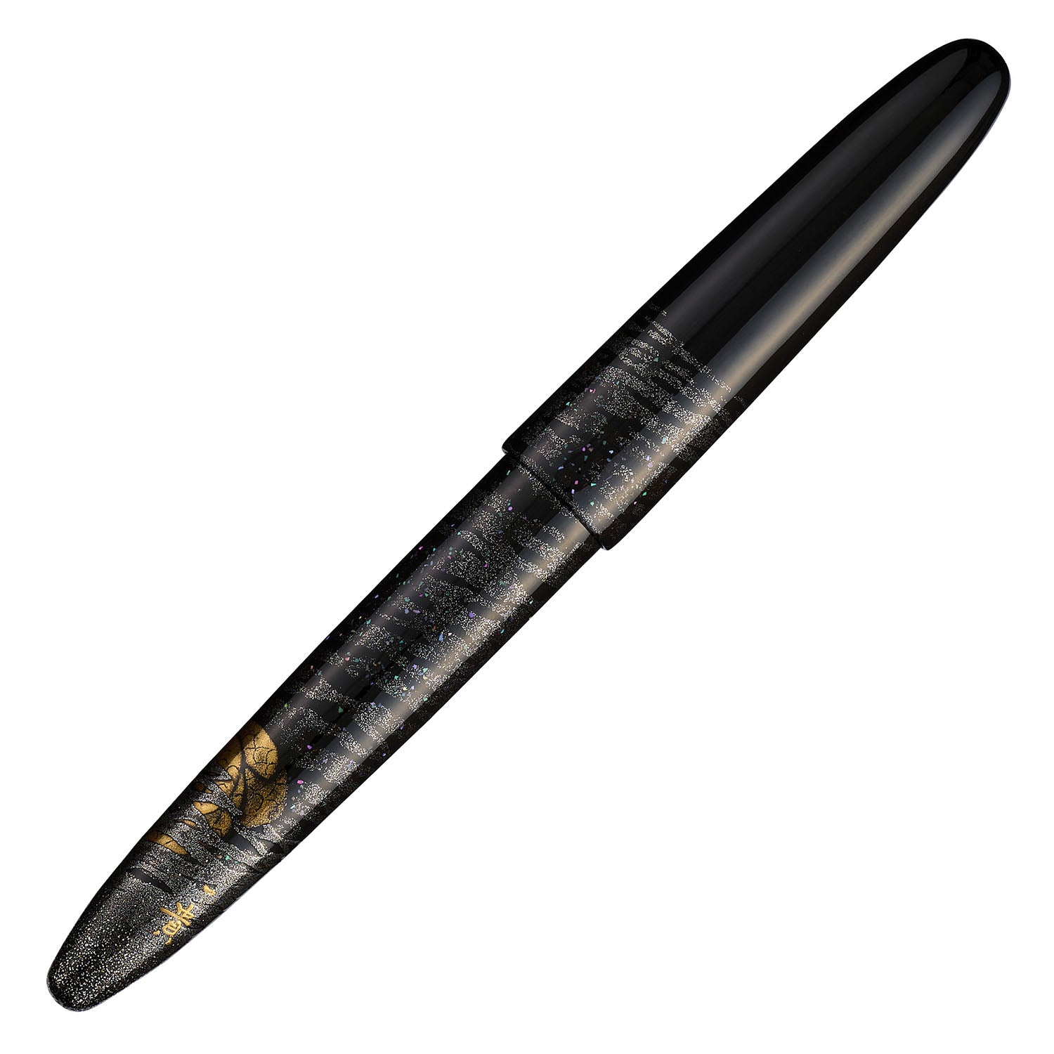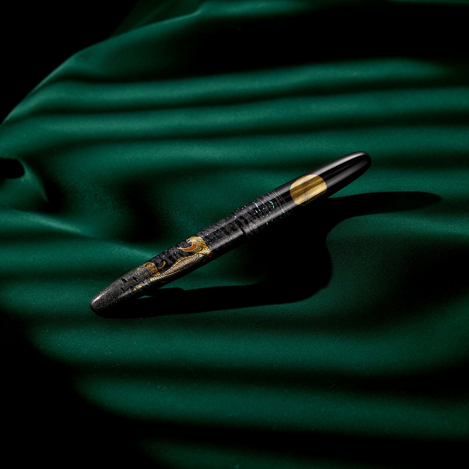 Cobra to Gekkou, or Cobra in the Moonlight, by artist Ikki Moroike, shows a cobra under a moonlit sky, with the cobra on the body of the pen, and the moon on the cap. Silent and dangerous, the cobra's scales shimmer in the silvery light like flowing water. Each pen features the artist's hand-drawn signature and serial number. Limited edition of only 50 pens worldwide.