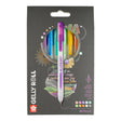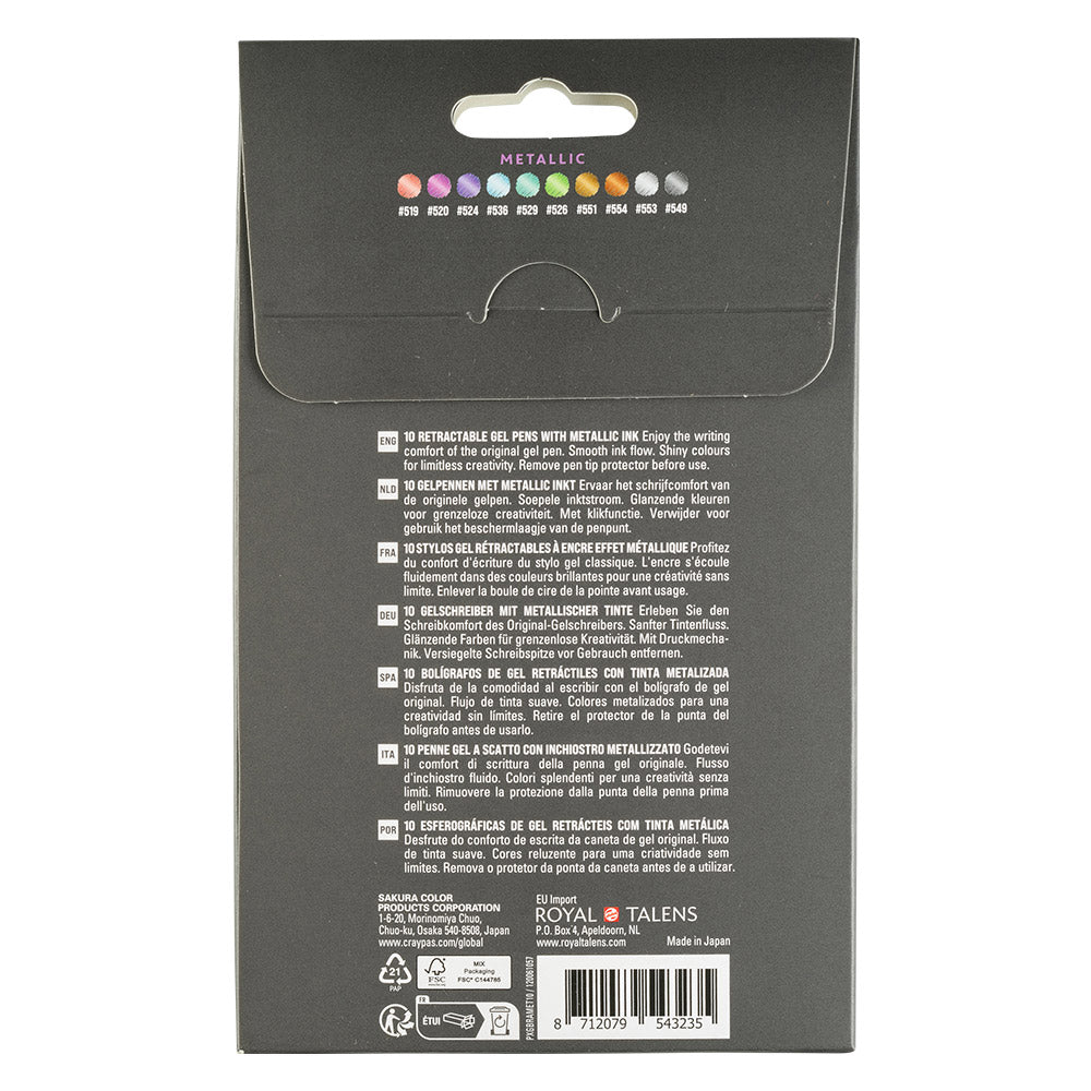 Set of 10 Gelly Roll Retractable Metallic gel rollerball pens, which create a pearlised, reflective sheen. Bright metallic colours.