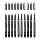 Set of 10 black pens containing one of every tip size available, from 003 to 12.