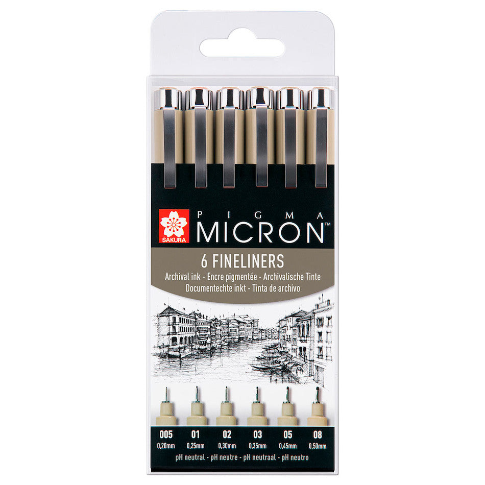 Set of 6 black pens in tip sizes 005, 01, 02, 03, 05 and 08.