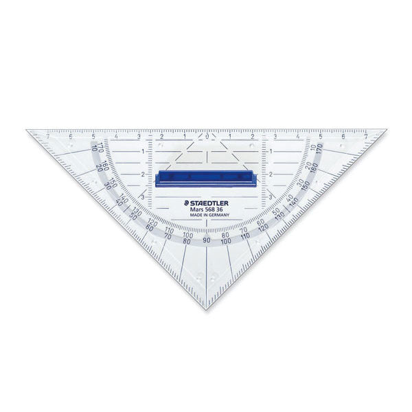 Staedtler 16cm Geometry Set Square. A useful and versatile piece of equipment, offering a protractor, ruler and 45° square in one. The ruler along the hypotenuse is gradutaed in mm and runs from 0 to 7cm from the centre in both directions. The protractor scale runs from 0 to 180 and also in reverse. The angle markings are carried foward to the edges. 2 vertical scale sare incorporated, running from 0 at the base, to 3.5cm.