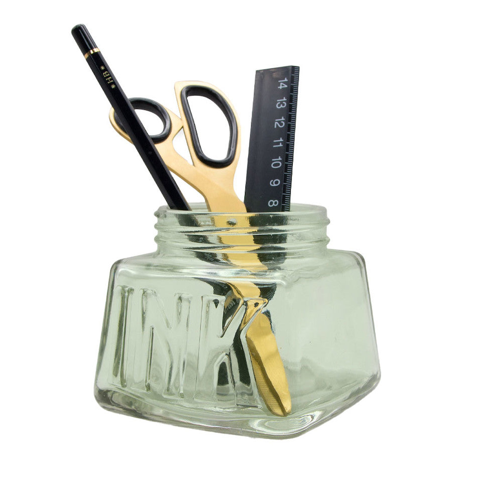 This glass pen pot isn't designed to actually be used as an inkwell. I mean you could, I suppose, but it's not intended to be used like that. It's quite large... and well, it doesn't have a lid... and it's quite large. No, instead it's intended to be used as a desk tidy for holding your pens, pencils, rulers and whatever other small bits and bobs you have around your desk that would look tidier in a pen pot.