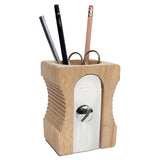 This supersize pencil sharpener pen-pot is made from rubber, wood, and stainless steel. They look great and keep your desk tidy, with enough room in there for your pens, pencils, rulers or anything small really.