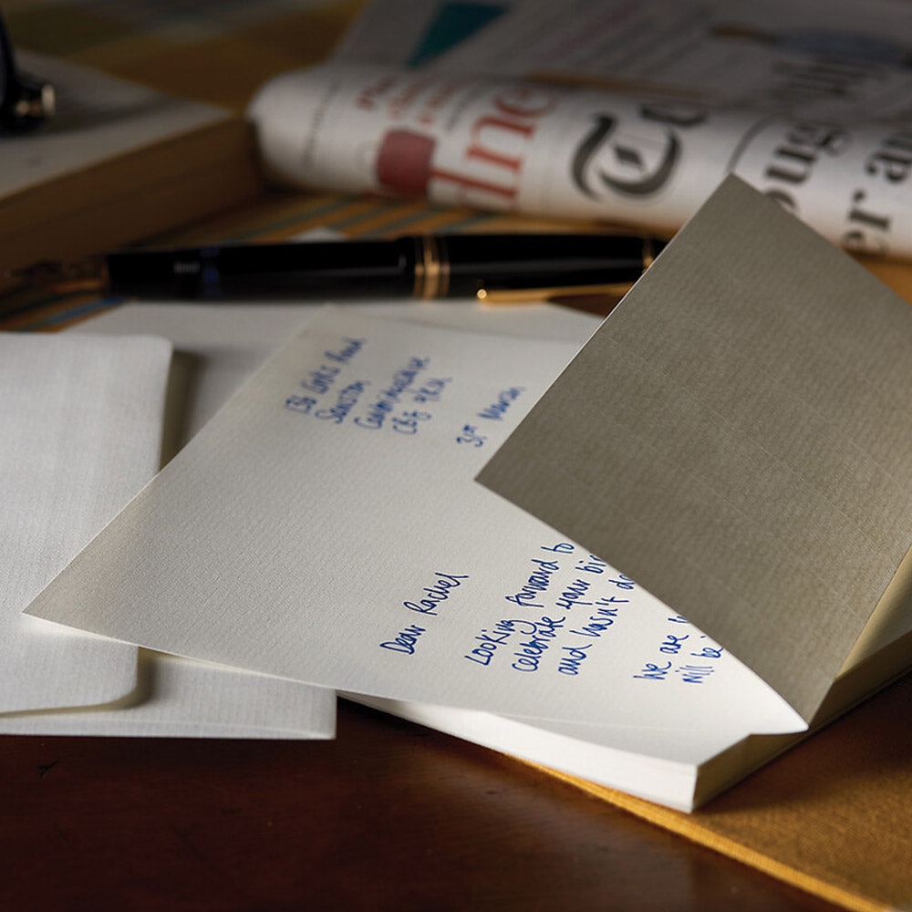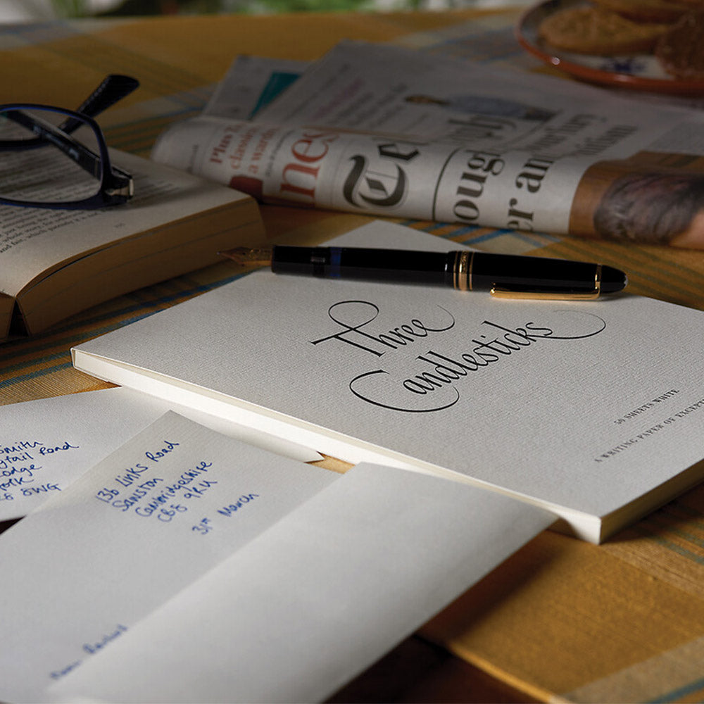 Three Candlesticks paper is beautifully made 'laid' paper, perfect for letter-writing with a touch of luxury. Made to work well with fountain pens, and in a classic pale cream-white.