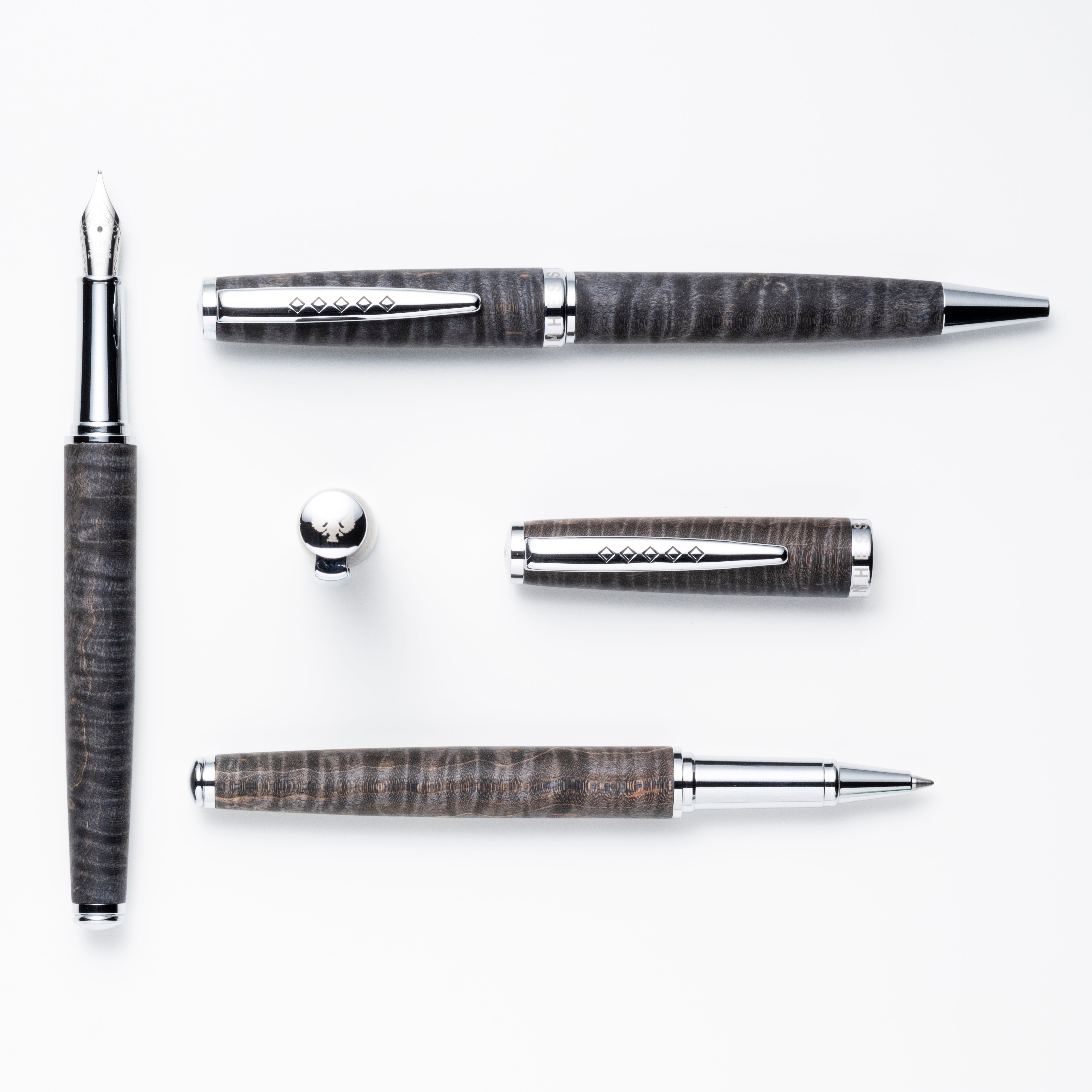 Tom Hessin's Edinburgh pens feature beautiful wooden barrels, in Forth Bridge Red or Stockbridge Stone, with their distinctive five-diamond clip. Natural wood grain is complemented by the highly polished chrome trim.