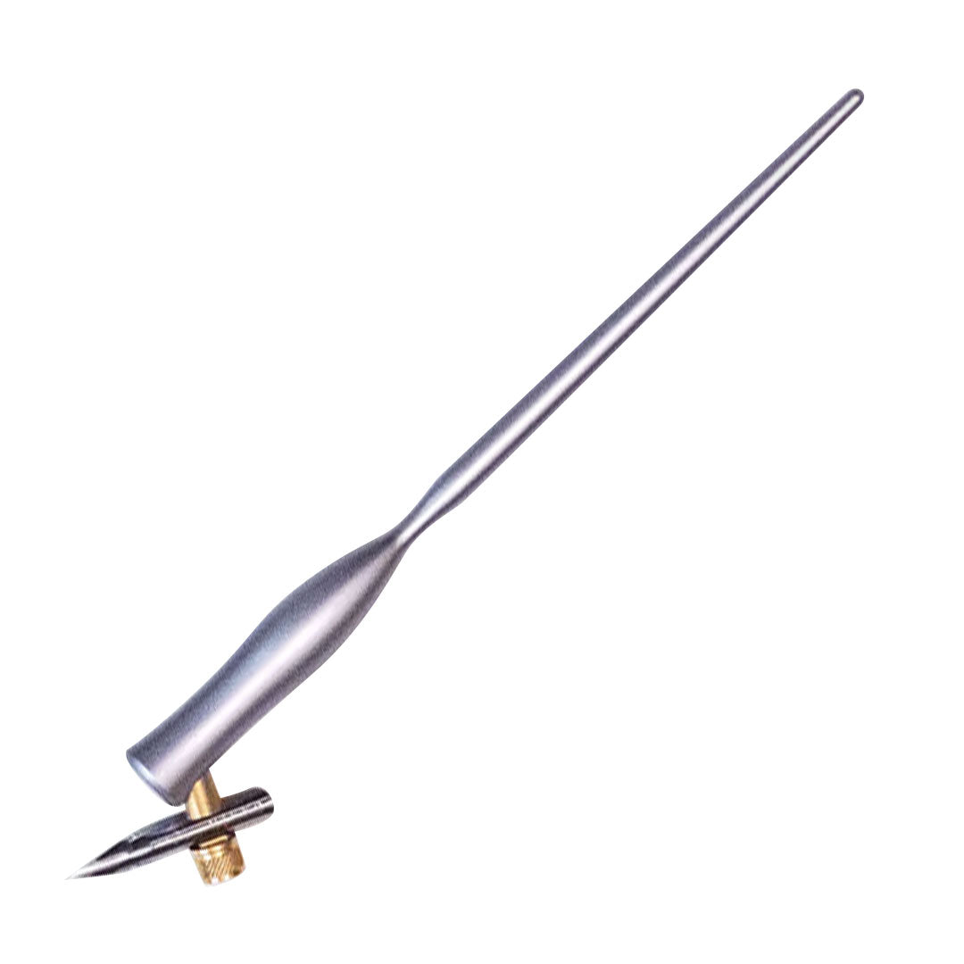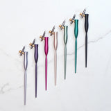 The Flourish Curve Oblique Nib Holder is a reinvented calligraphy pen. The nib twists in and does not require a screw. The design is made in such a way that it can hold a variety of nib sizes, from a Brause 66EF to a Nikko G nib. It can also hold 3.5mm pencils leads if you so desire!