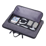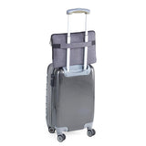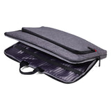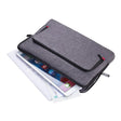 Small portfolio bag for carrying notepads, tablets and small electronic devices. Strap for fastening to a trolley. Side pocket for smaller electronics.