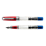 TWSBI Diamond 580 Fountain Pen Red Blue Transparent. Transparent barrel reveals the filling mechanism, a built-in piston-filler with a very smooth action. Chromed metal trim and pocket clip. TWSBI logo nicely finishes the top of the pen's cap. Rubber o-ring on cap thread ensures an airtight seal to prevent ink drying out in the pen, whilst also ensuring that the cap is firmly attached to the pen when not in use.