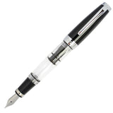 TWSBI Diamond Mini Fountain Pen Classic. Transparent crystal-clear diamond-faceted barrel reveals the filling mechanism, a built-in piston-filler with a very smooth action, whilst also allowing an uninterrupted view of the ink level and colour. Black cap, grip section and barrel end all contrast nicely with the clear barrel of the pen. Chromed metal trim and pocket clip. TWSBI logo nicely finishes the top of the pen's cap. Rubber o-ring on cap thread ensures an airtight seal to prevent ink drying out in the pen, whilst also ensuring that the cap is firmly attached when not in use.